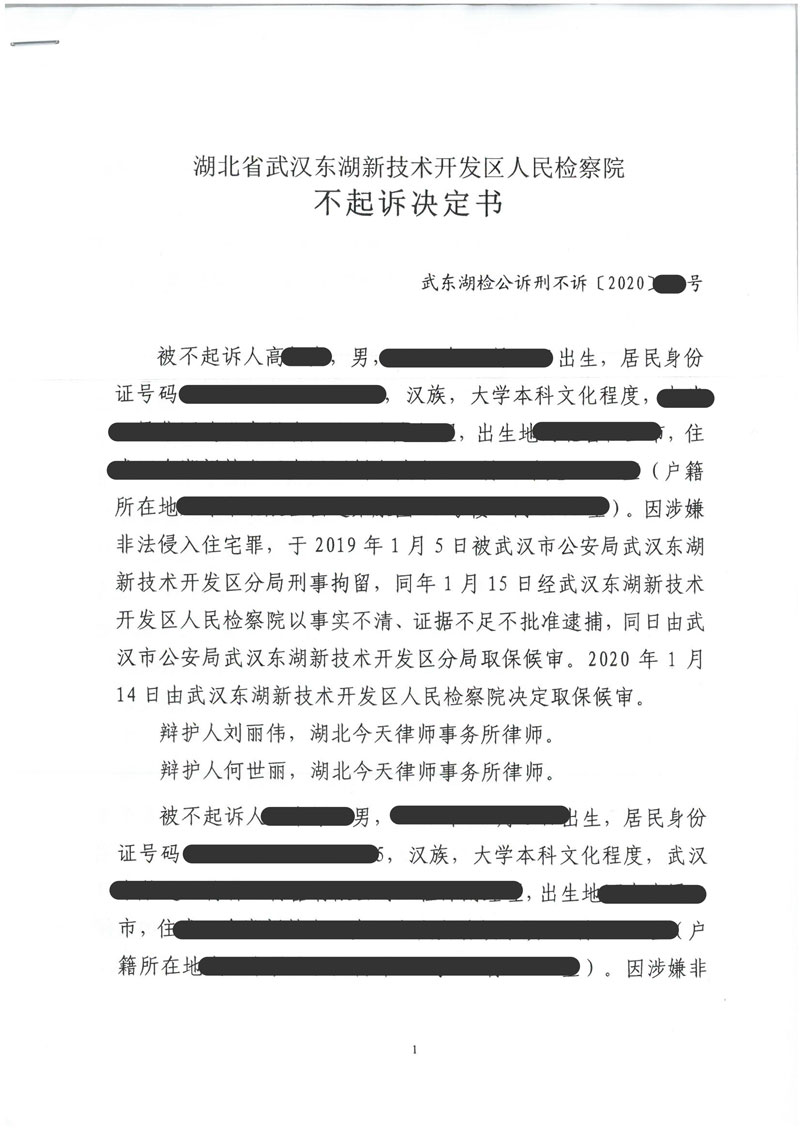 高某某不起诉决定书